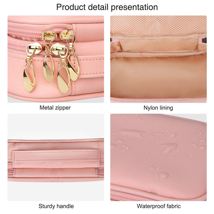 휴대용 방수 PU 여행 세면 용품 가방 사랑스러운 핑크 컬러 여성 브러시 슬롯 포켓과 주최자 가방을 확인하십시오